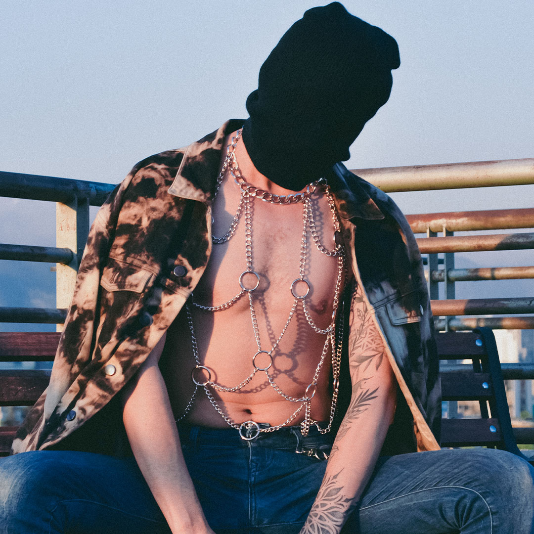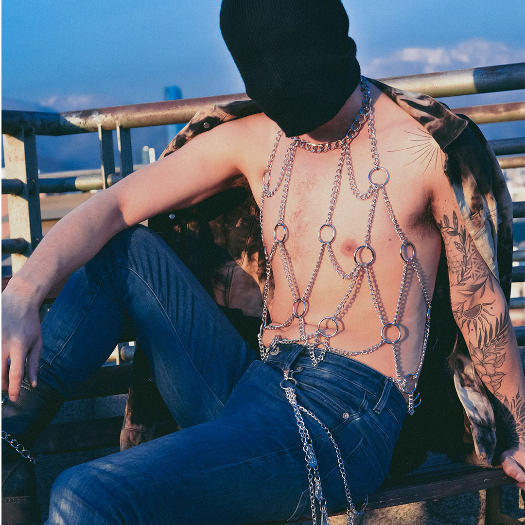 Ataraxia envuelve tu torso en un juego de cadenas que equilibra fuerza y elegancia. Aunque parezca imponente, su estructura de aluminio lo hace sorprendentemente liviano y cómodo.