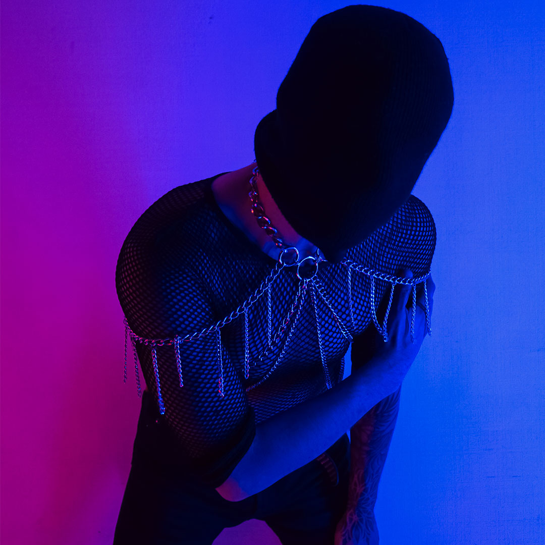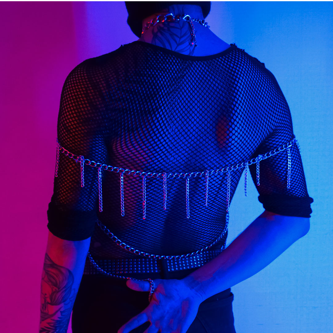 Desde el centro del cuello nacen cuatro cadenas que cruzan tu pecho y dos más que recorren tus hombros, acompañadas ahora por una serie de cadenas colgantes que le dan un movimiento único a cada paso.