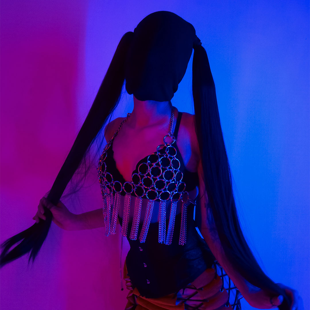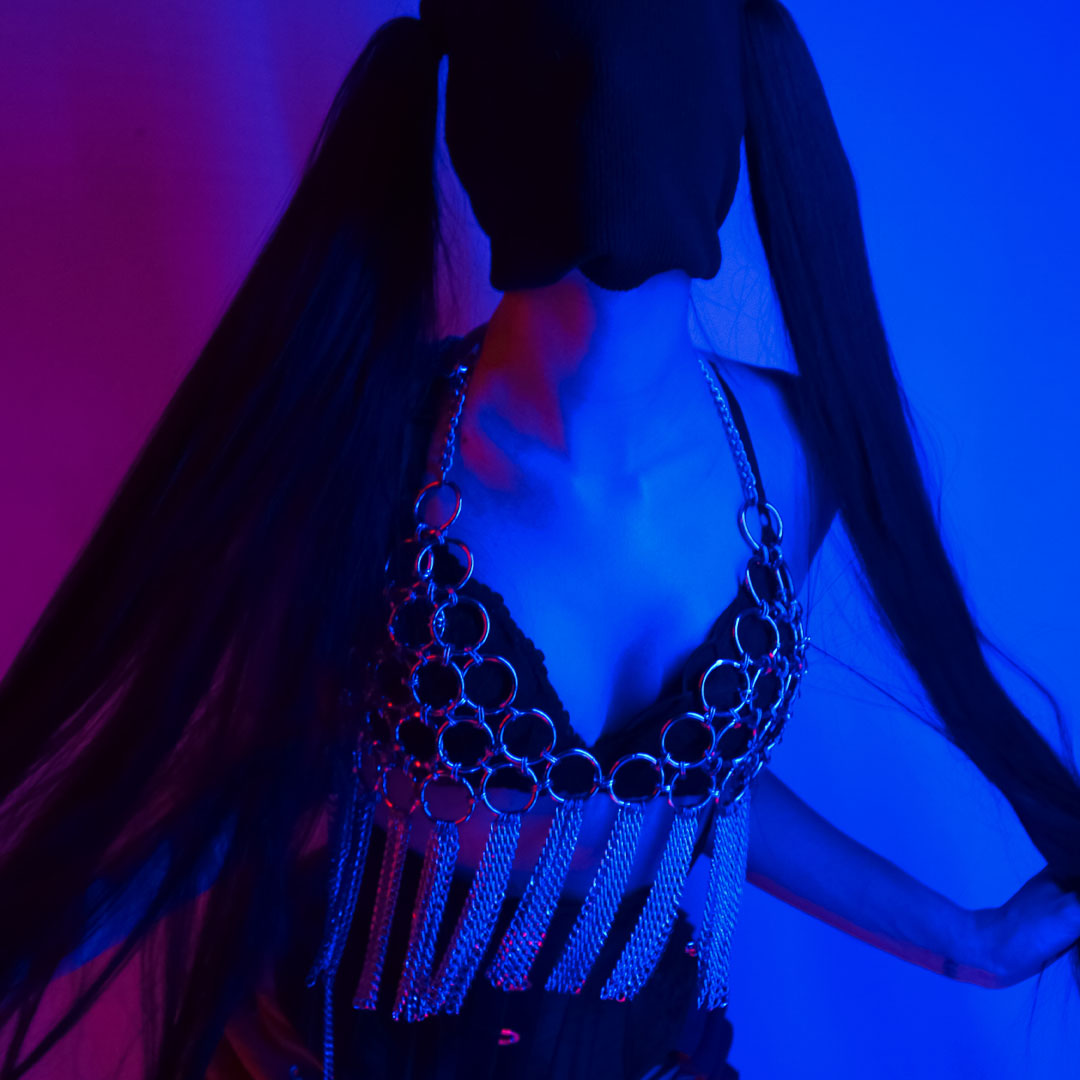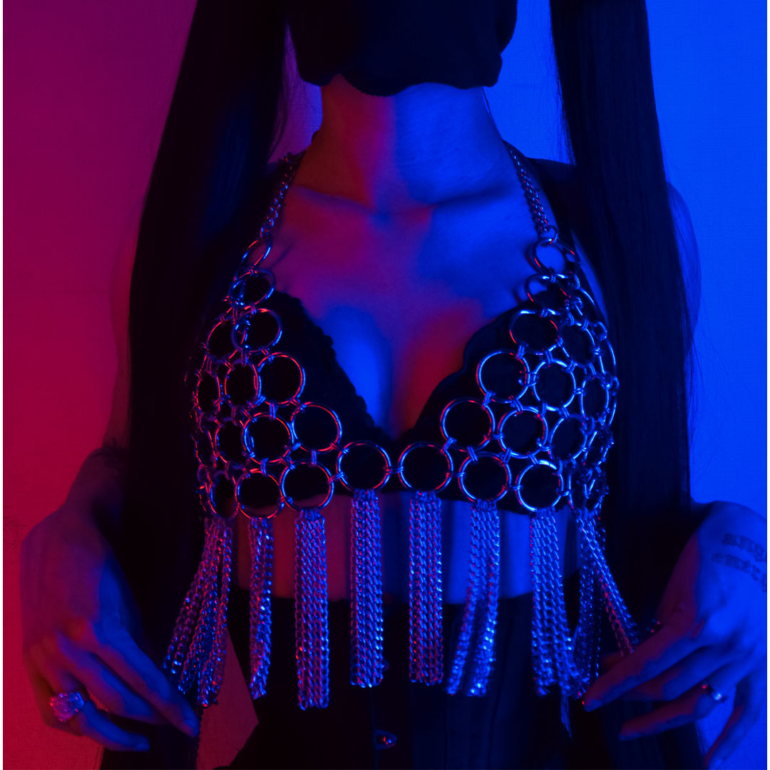 Hecho a medida con adaptadores en cuello y cintura para un calce perfecto, este modelo incorpora un conjunto de cadenas colgando de cada argolla, creando un movimiento único que acompaña cada uno de tus pasos.