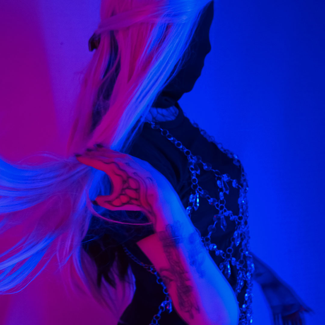 Este vestido completo, hecho a medida, combina argollas y dijes de vidrio para crear una estructura elegante y poderosa.